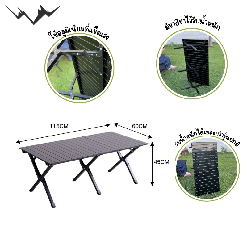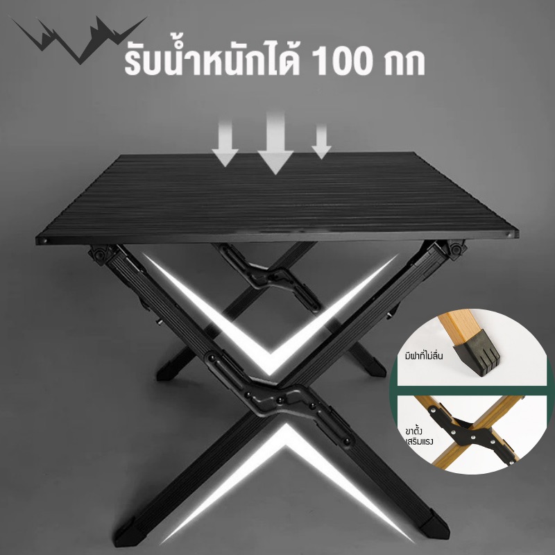 โครงสร้างอลูมิเนียมแข็งแรง รับน้ำหนักแบบกระจายน้ำหนักได้ถึง 100 กก. ใช้กับเตาแก๊สแคมป์ได้ แนะนำวางให้มั่นคง และหลีกเลี่ยงการรับแรงกดจุดเดียวบริเวณขอบโต๊ะ