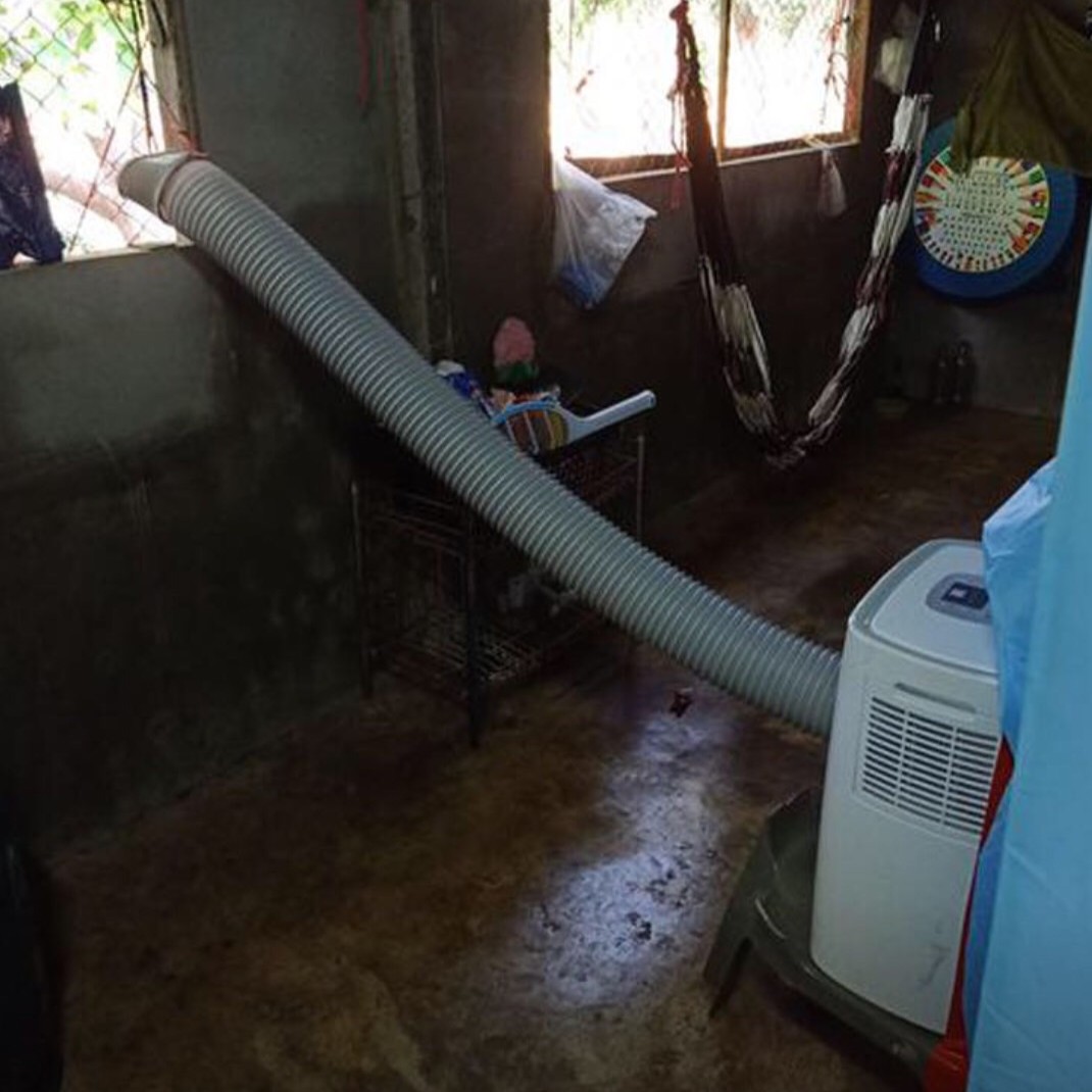 ต่อให้แน่นและจัดท่อให้ตรงที่สุด โค้งขึ้นเหนือแอร์เล็กน้อยเพื่อช่วยให้ลมร้อนลอยขึ้น ลดการย้อนกลับเข้าห้อง