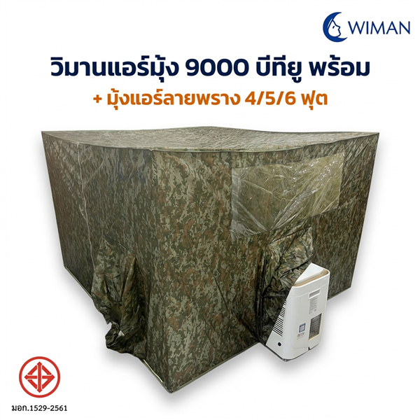 ชุดแอร์เคลื่อนที่ WIMAN 9000 BTU + มุ้งแอร์ลายพราง (4/5/6 ฟุต) ❄️ กำลังเย็น 9000 BTU เย็นจริงใน ~5 นาที 🔌 เสียบปลั๊กใช้งานได้ทันที ไม่ต้องติดตั้ง 🎖️ มุ้งแอร์ลายพราง เหมาะแคมป์ปิ้ง/ภาคสนาม 🔇 เสียงเงียบ (~40–50 dB) ✅ มอก. 1529-2561 + รับ